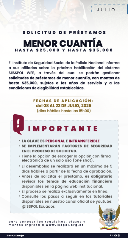 ComunicadosSolicitud de préstamo: MENOR CUANTÍA Posted on 3 de julio de 20253 de julio de 2025 by Isspol Informativo 03 Jul Isspol Informativo INSTRUCTIVO PARA PRECANCELACIÓN Y ABONOS DE CRÉDITOS Solicitud de préstamo: 4 RMU