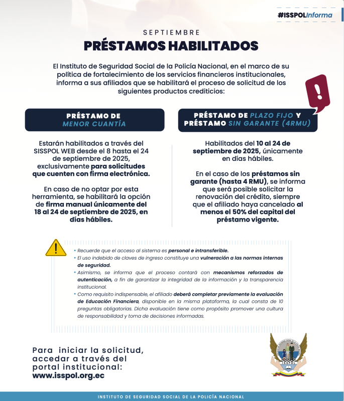 ComunicadosPRÉSTAMOS HABILITADOS – SEPTIEMBRE Posted on 5 de septiembre de 20255 de septiembre de 2025 by Isspol Informativo 05 Sep Isspol Informativo CONOCE CÓMO ACCEDER AL PLAN DE ATENCIÓN INTEGRAL PARA EL ADULTO MAYOR INSTRUCTIVO PARA PRECANCELACIÓN Y ABONOS DE CRÉDITOS