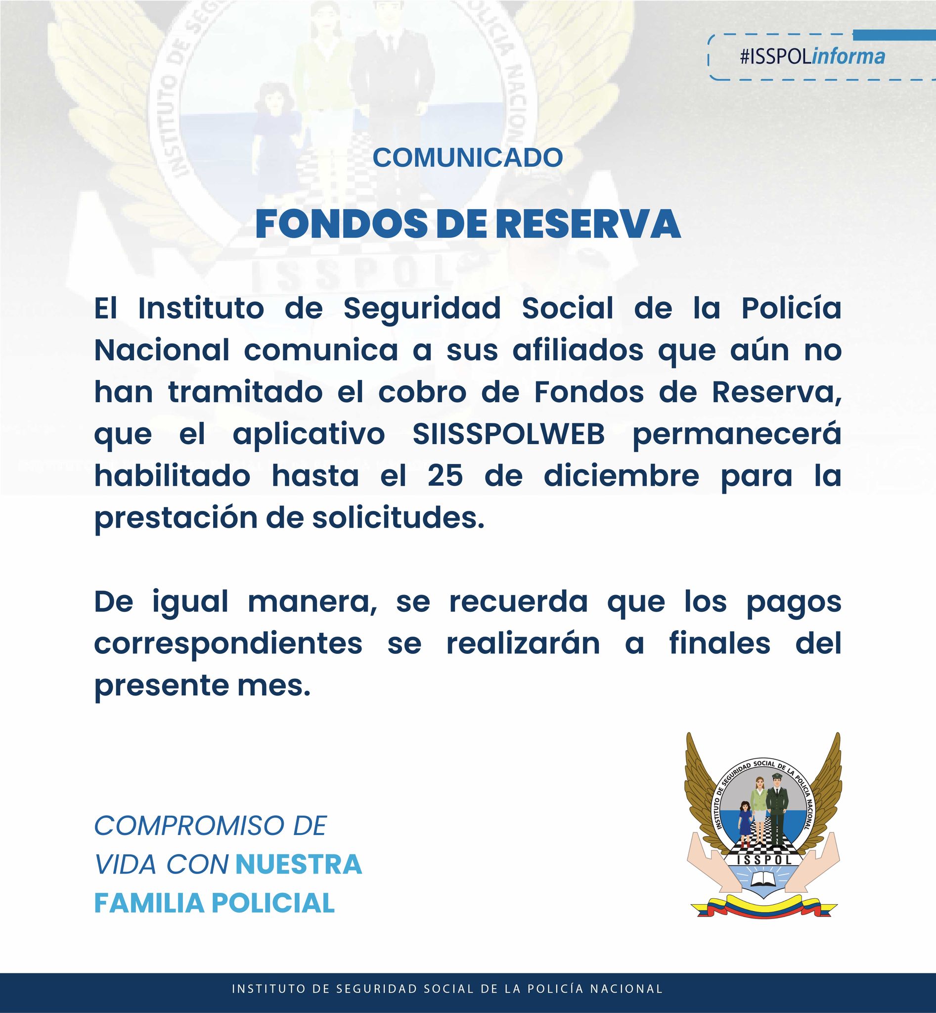 Comunicados, NoticiasFONDOS DE RESERVA Posted on 23 de diciembre de 20256 de enero de 2026 by ISSPOL informa 23 Dic ISSPOL informa MANTENIMIENTO TECNOLÓGICO Y DESINFECCIÓN INTEGRAL ¡FELICES FIESTAS!