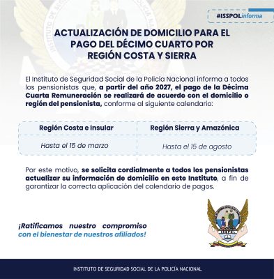 El Instituto de Seguridad Social de la Policía Nacional informa a sus pensionistas que, a partir del año 2027, el pago de la Décima Cuarta Remuneración se realizará según el domicilio o región del pensionista. Por este motivo es importante que actualices tu información de domicilio para asegurar la correcta aplicación del calendario de pagos.